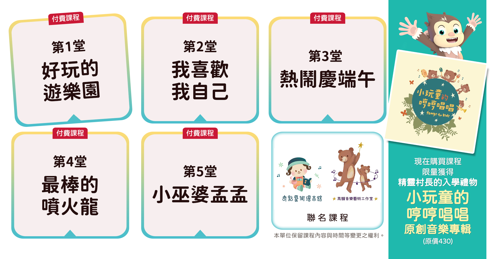幼兒時期的音樂經驗很寶貴,把握啟發音樂智能的重要時光,這次815與奇點藝術繪本館、高韻音樂藝術工作室的可愛老師們精心為孩子設計專屬課程,《奇點唱遊小精靈2》全新學程共計5堂課,老師們將在課程中帶領孩子一起天天唱歌玩遊戲,輕輕鬆鬆釋放孩子音樂天賦!