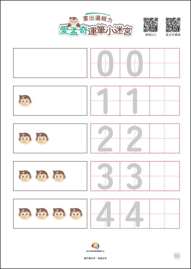 想要畫畫也沒問題,好多可愛圖案讓孩子塗繪!還有數字練習,依照0-9的順序、或者打亂數字順序都可以,再練習數數,看看一共有幾隻愛孟奇在裡面呢?