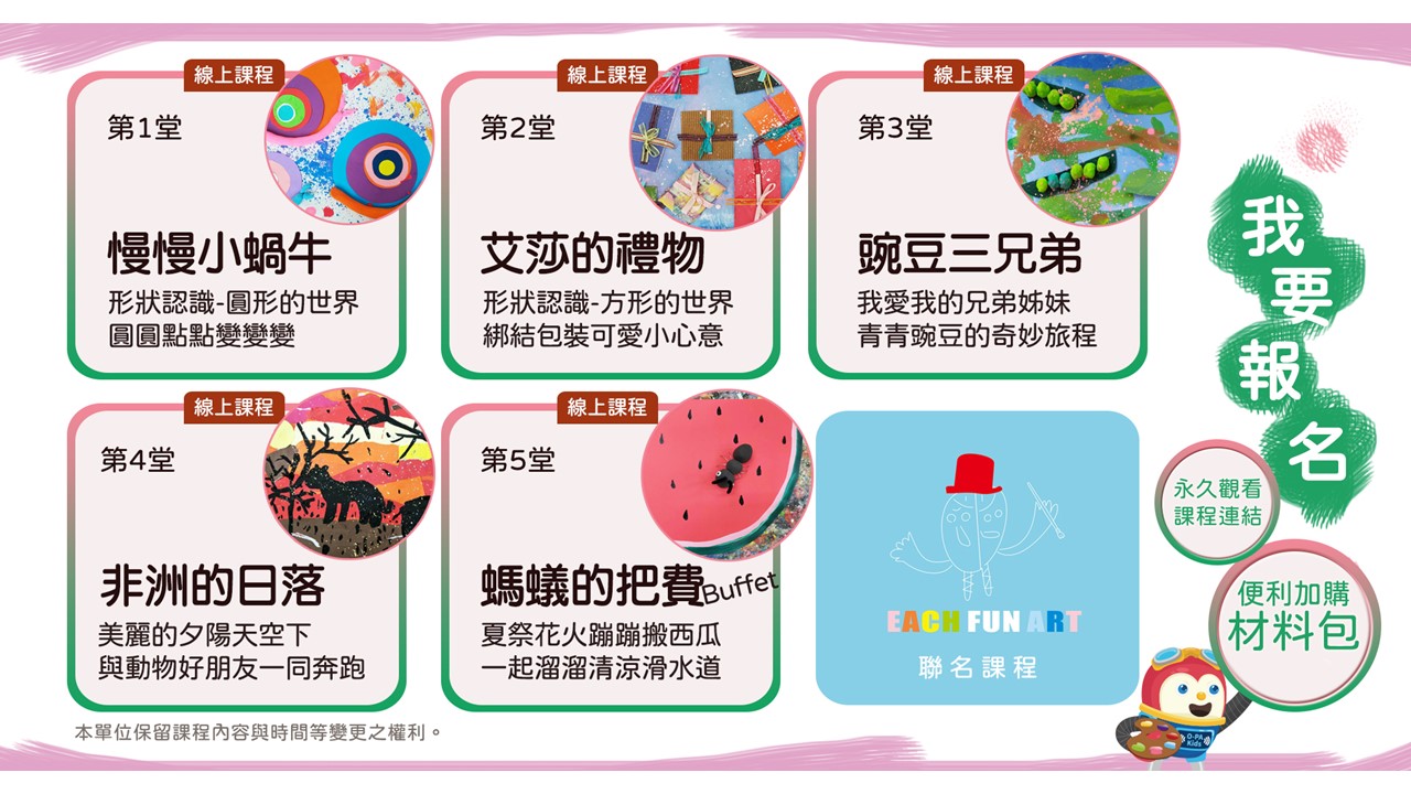 由《小紅帽藝術天地》和《 Each Art 創意想像空間-豐原繪本館 》美術老師專為孩子設計專屬課程與可供加購的材料包,因這次的材料非居家易得,爸媽不用出門奔波採買,打開材料包配合課程影片即可與老師一起完成藝術作品。